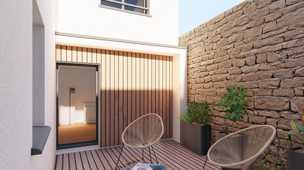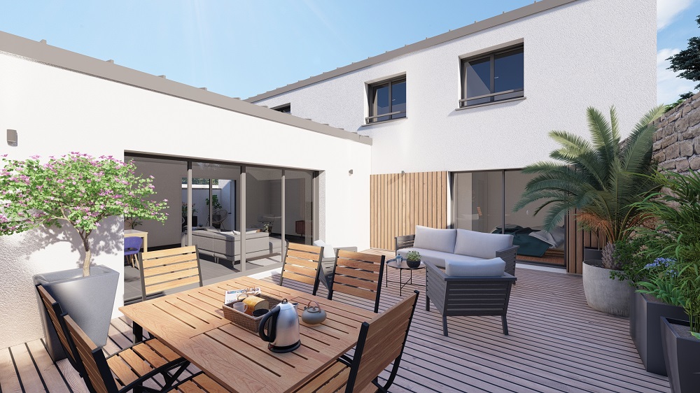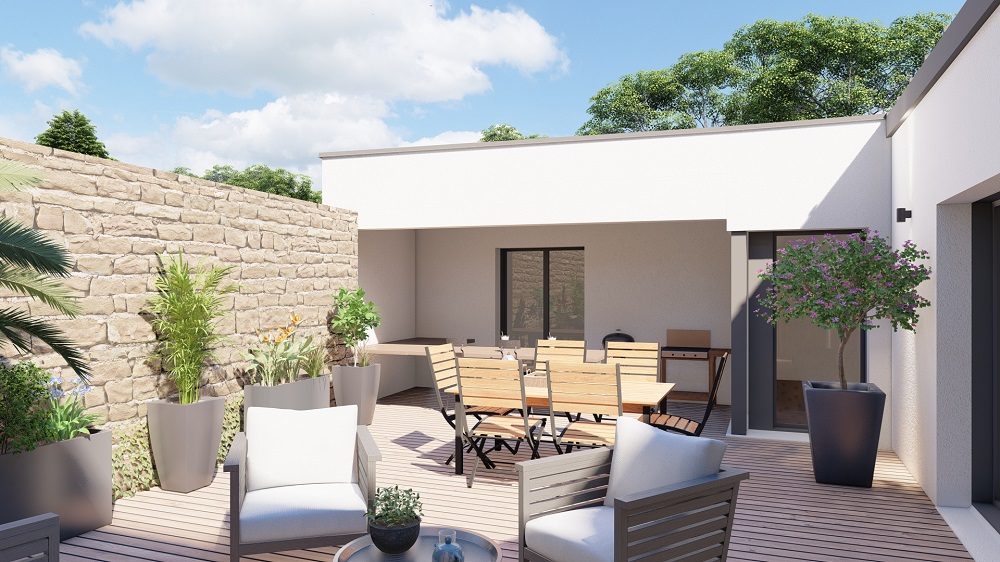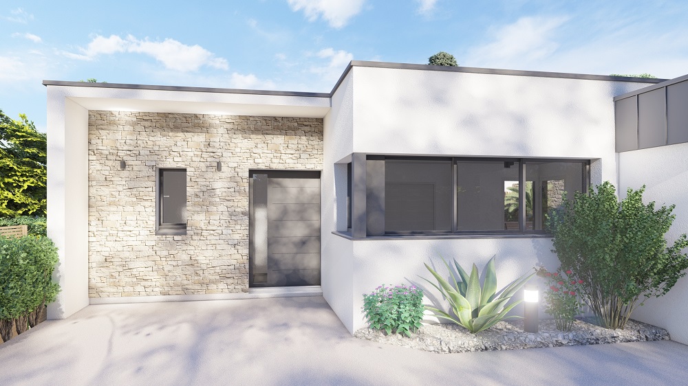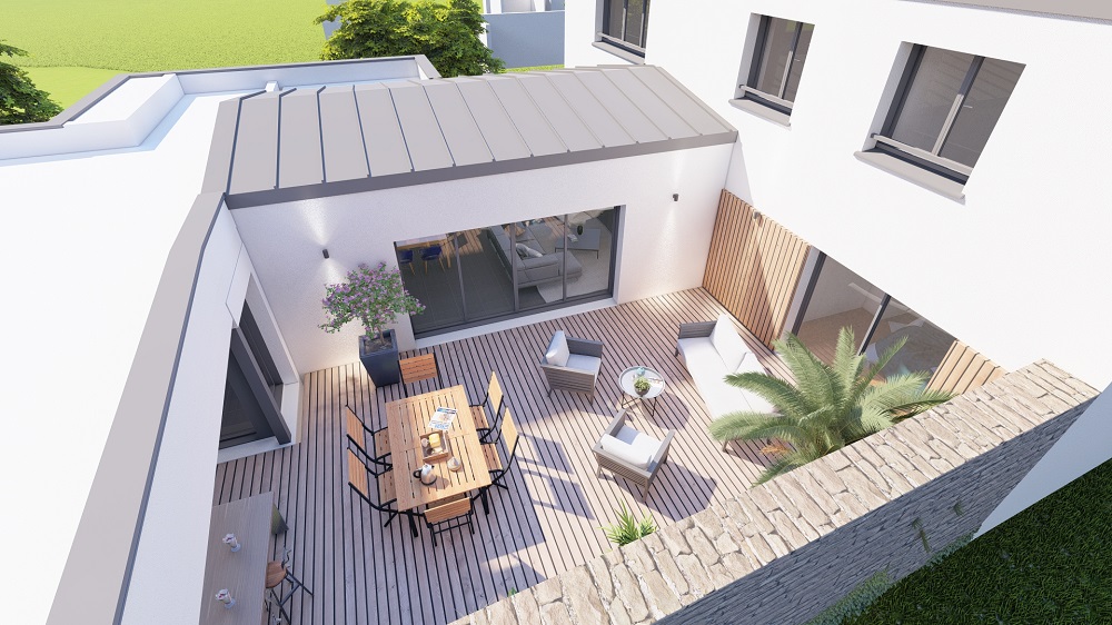 Be Home constructeur de maison moderne à Pontivy propose ici une architecture unique et originale. L’étage est disposé en arrière plan de manière à ce que le soleil puisse donner sur les deux patios.