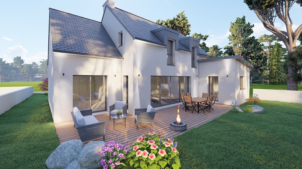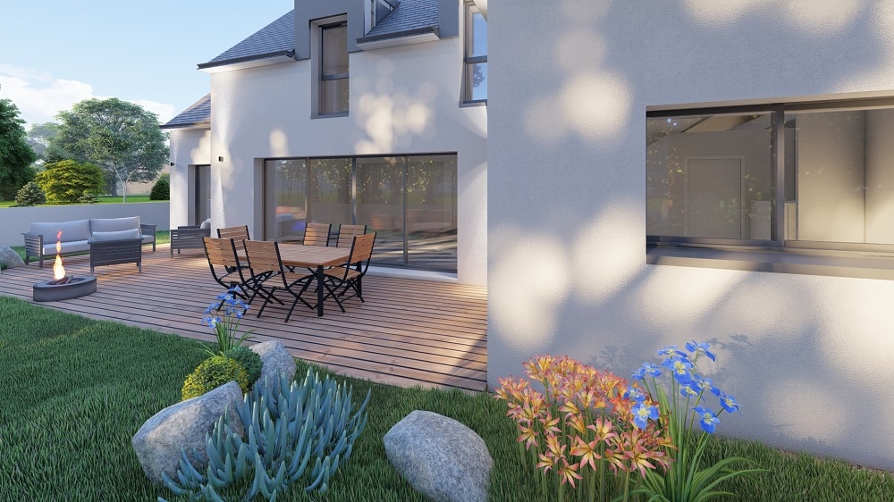 Les matériaux sont choisis avec soin : enduit clair, menuiseries aluminium bi-couleur, bavettes alu, et un travail sur les volumes qui dynamise la façade sans excès. La maison s’ouvre largement sur le jardin, avec une terrasse extérieure accessible depuis le séjour et la suite parentale, idéale pour les repas en plein air ou pour installer un salon de jardin à l’abri des regards.
