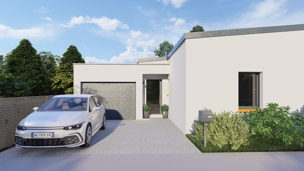 Ce projet de maison individuelle à Baud présente un design moderne et épuré. La forme géométrique simple et les lignes droites lui donnent un aspect contemporain, tandis que la toiture légèrement inclinée ajoute une touche élégante et dynamique. Le choix de matériaux, comme les façades enduites et les grandes ouvertures, contribue à l’effet minimaliste tout en maximisant la lumière naturelle.