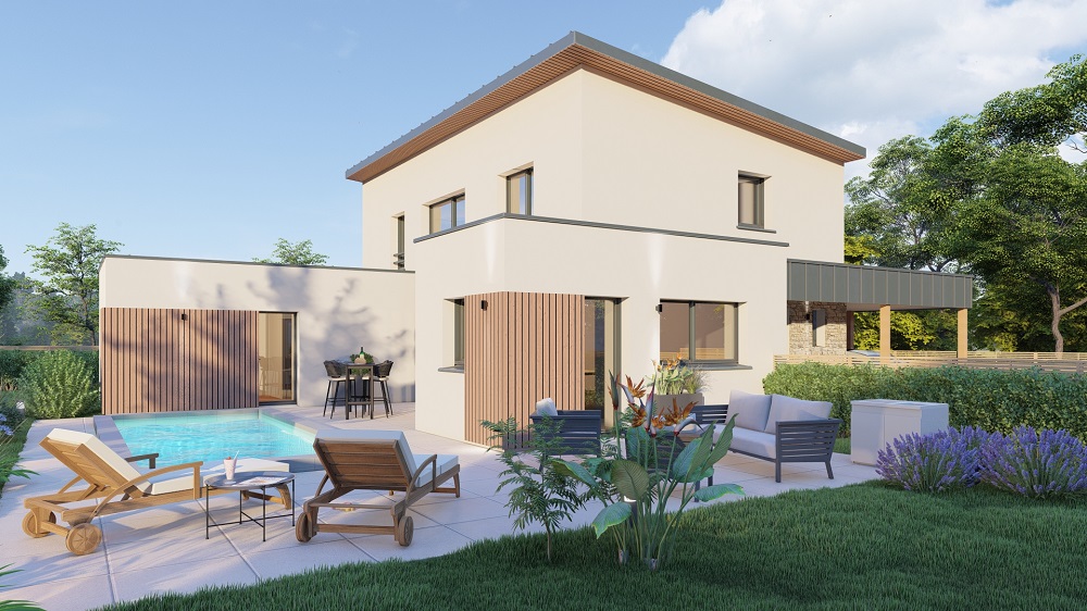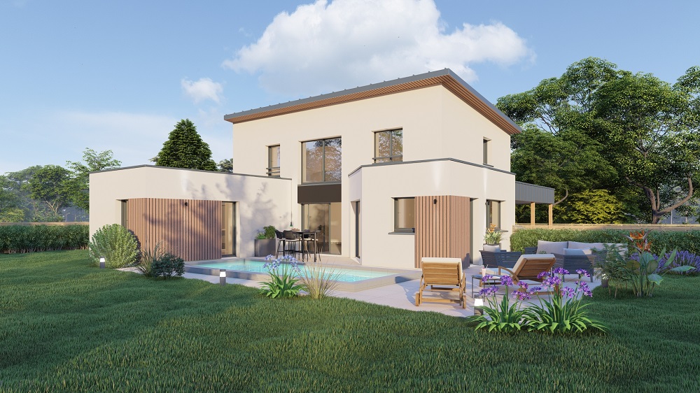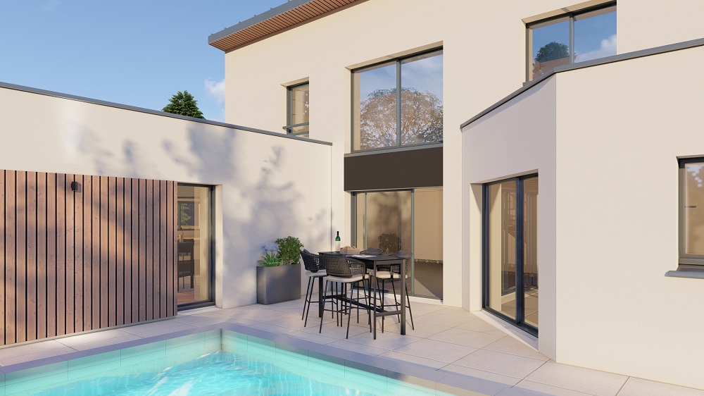 Le toit plat est une caractéristique moderne ici avec le toit en zinc du volume principal et les toit terrasses des ailes et du garage. La terrasse avec piscine et l’espace lounge autour de la maison donnent un aspect de vie contemporaine, axée sur le confort et la convivialité. L’espace extérieur est conçu pour profiter de moments de détente tout en ayant un aspect pratique et fonctionnel.