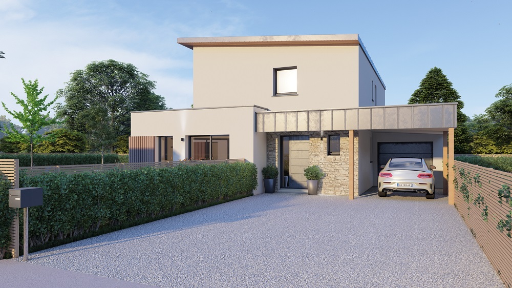 L’architecture de cette maison sur-mesure présente un design moderne et épuré avec des lignes géométriques simples. Le mélange de couleurs neutres, principalement le beige clair de la façade, et l’utilisation du bois sur les extensions, de parement pierres et de zinc ajoutent de la chaleur et une touche naturelle. Les fenêtres sont grandes et nombreuses, favorisant une luminosité abondante à l’intérieur et créant un lien fort entre l’intérieur et l’extérieur, surtout avec l’aménagement extérieur bien pensé.
