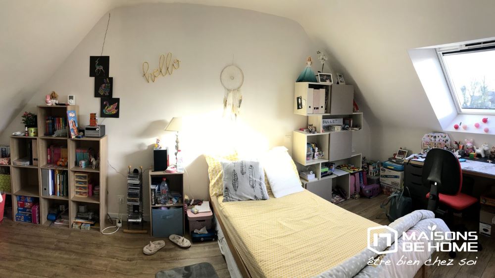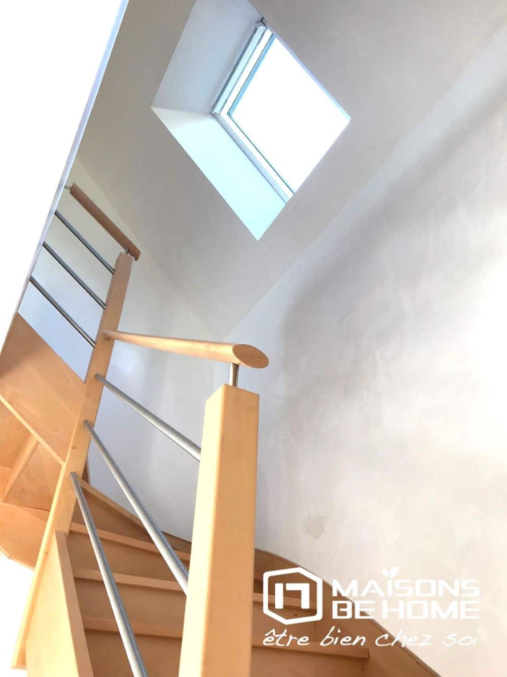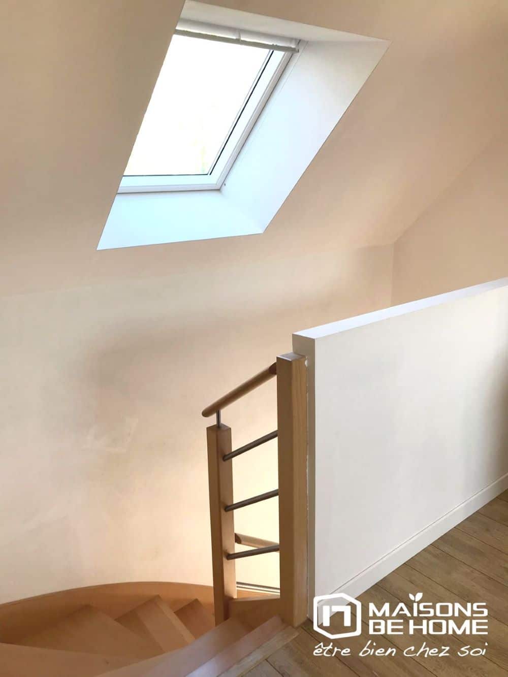 L’étage, accessible par un escalier en bois au design épuré et contemporain, est un espace entièrement dédié à la tranquillité. Les deux chambres occupent toute la largeur des pignons, offrant un volume remarquable et une impression d’espace généreux. Les grandes fenêtres Velux, positionnées stratégiquement, laissent entrer une lumière naturelle abondante tout au long de la journée. Ces pièces, idéales pour des enfants ou des invités, offrent un cadre apaisant et confortable, en phase avec le style d’une construction de maison traditionnelle.