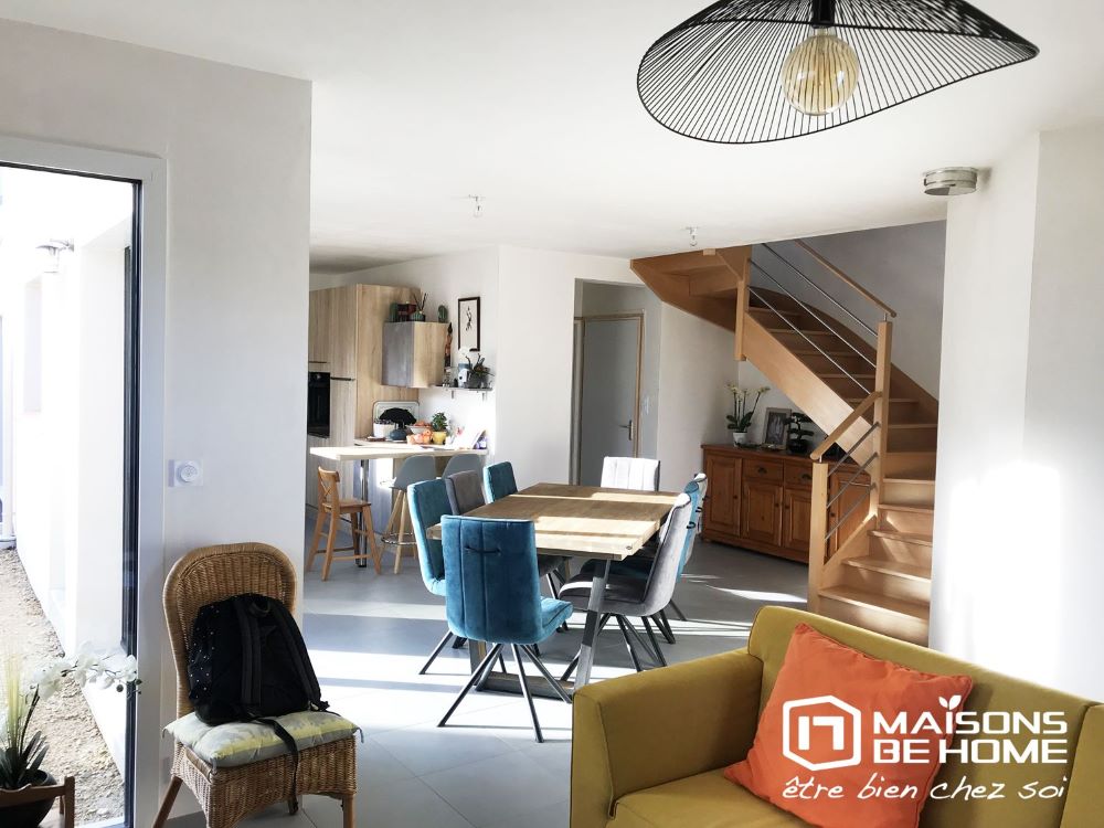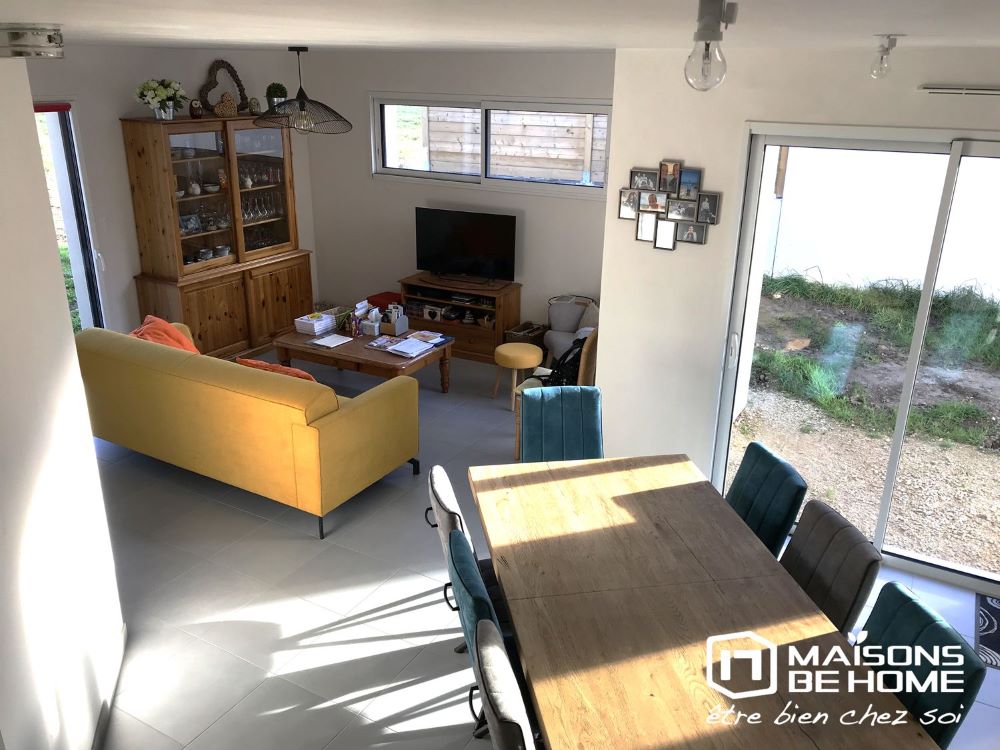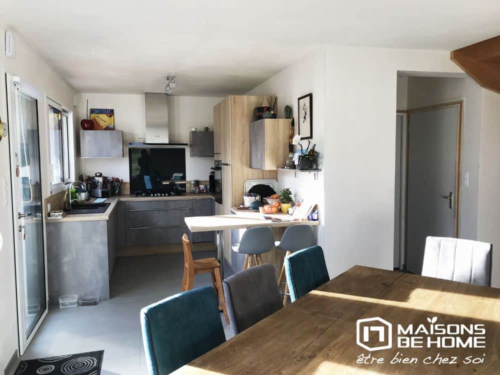 La cuisine ouverte, aménagée avec soin, combine fonctionnalité et esthétisme. Bien intégrée dans l’espace de vie, elle permet de cuisiner tout en restant connectée avec la salle à manger et le salon. La salle à manger, spacieuse et conviviale, devient le lieu idéal pour partager des repas autour d’une grande table en bois. Quant au salon, il offre un espace chaleureux et lumineux, grâce aux baies vitrées qui permettent une belle transition entre l’intérieur et l’extérieur. Ces ouvertures donnent accès à une terrasse ensoleillée, parfaite pour profiter de moments de détente en famille, renforçant le charme de cette maison traditionnelle proche de la mer