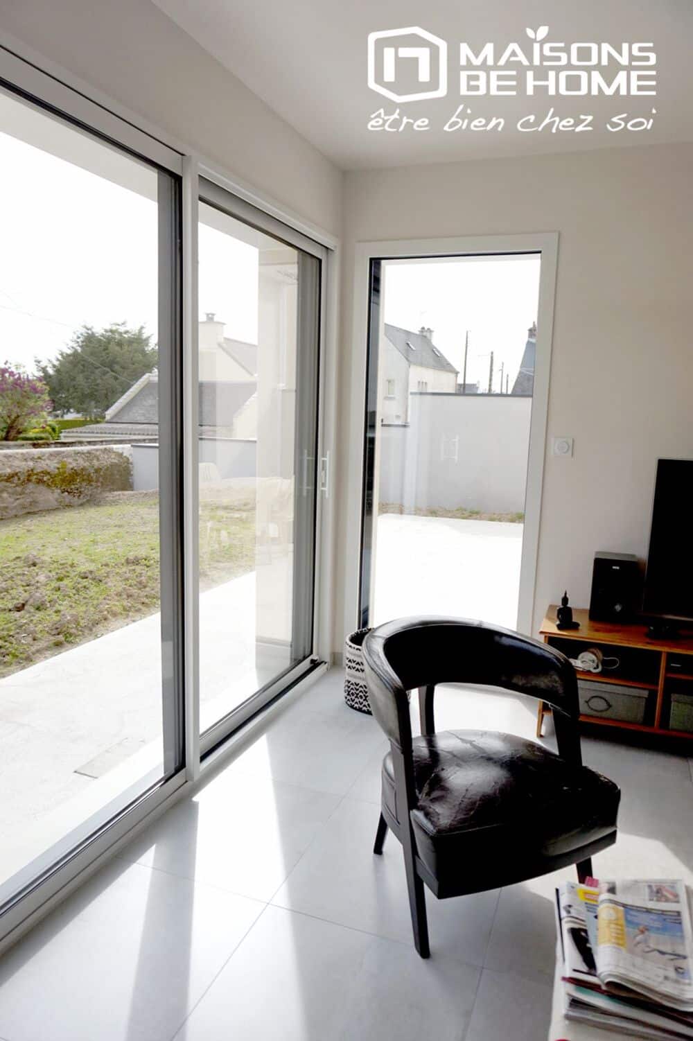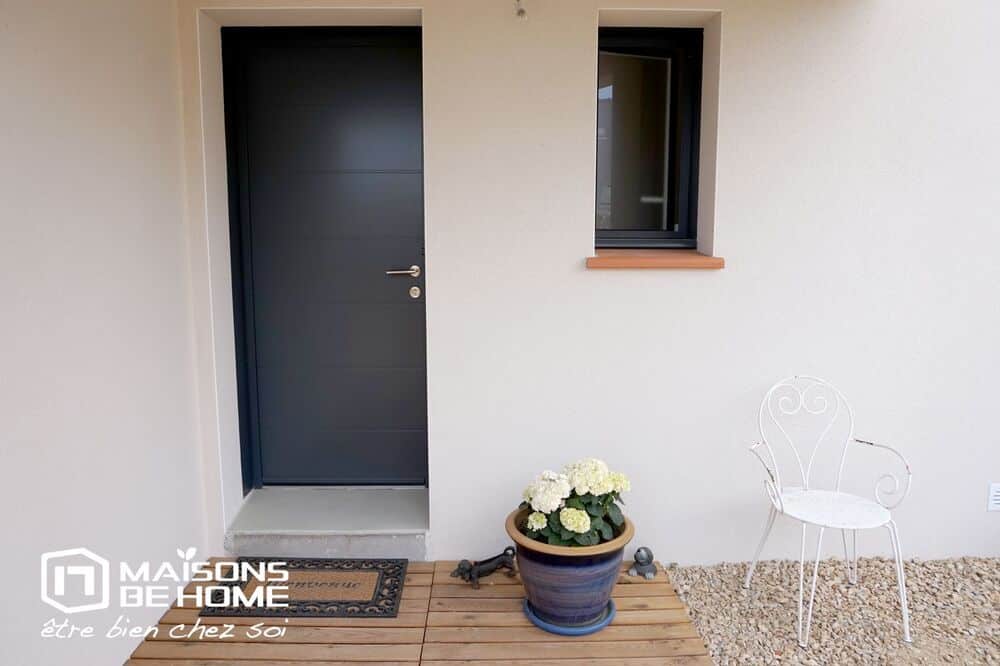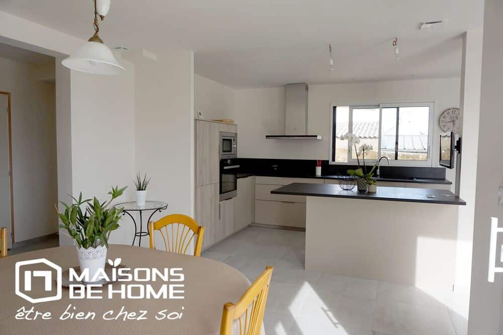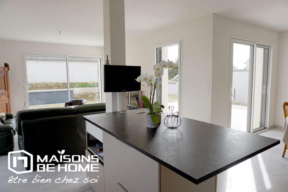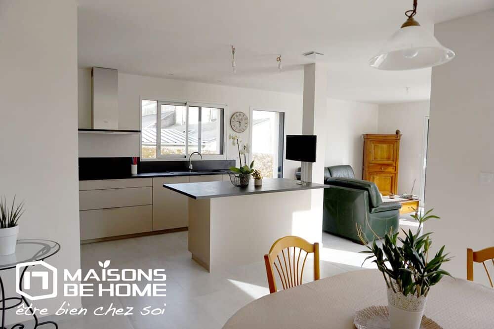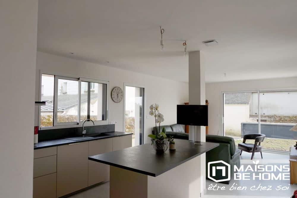 Pour l’agencement intérieur nos clients ont choisi des matériaux de qualité (grandes dalles carrelées, plan de travail couleur ardoise pour la cuisine, huisserie bi-color (gris anthracite à l’extérieur et blanche à l’intérieur).