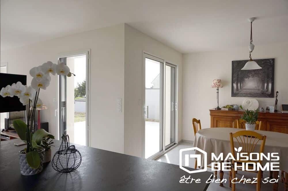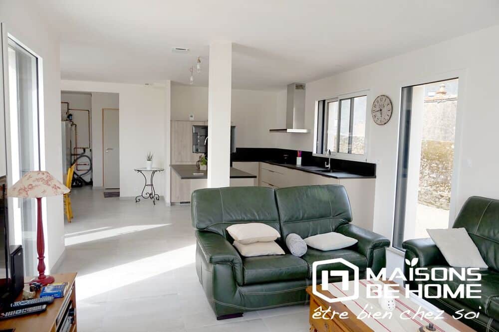 Le salon, avec ses deux grandes baies vitrées formant un angle, s’ouvre sur une terrasse et un jardin, offrant un cadre agréable pour profiter de la lumière naturelle et de l’extérieur. La pièce de vie, tranversante est baignée par la lumière tout au long de la journée, grâce à ses muliples baies vitrées !