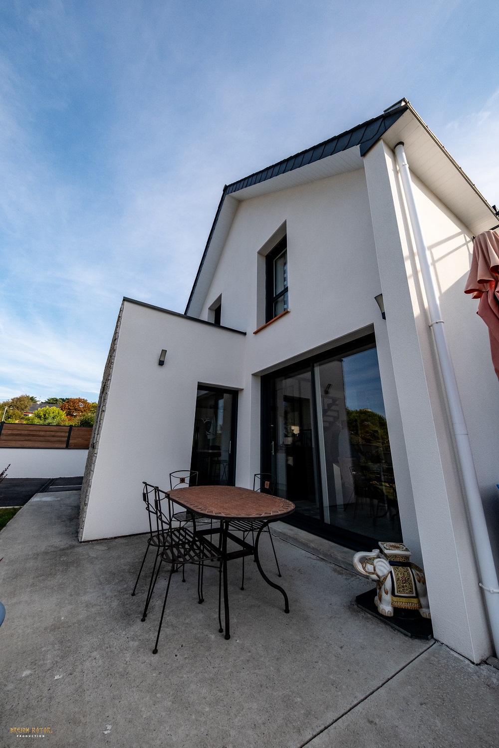 L’architecture de cette maison individuelle sur-mesure offre à ses occupants différents points de vue, depuis la maison sur le jardin. Ses différentes avancées viennent casser la monotonie du monobloc de la maison traditionnelle bretonne. La terrasse d’angle de cette construction de maison à Sarzeau offre des espaces dédiées à plusieurs pièces du rez-de-chaussée. Cette maison bretonne se veut contemporaine avec son parement de pierres et son enduit clair, ses huisseries gris anthracite et sa couverture ardoise et zinc.