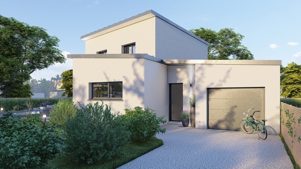 Be Home, constructeur de maison à Brech, dans le Morbihan, a accompagné ce projet de maison individuelle destinée à la résidence principale. La maison se développe sur deux niveaux avec un garage accolé, et adopte un style contemporain marqué par des volumes rectilignes et des toitures en zinc à faible pente de 5°. Avec 113,65 m² de surface habitable, ce projet offre une répartition claire et bien proportionnée.