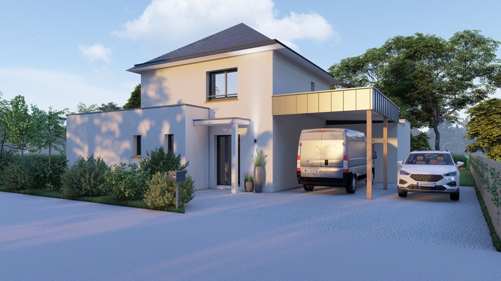 Une terrasse prolonge les espaces de vie. Le carport couvert de 23,40 m² offre un stationnement protégé.