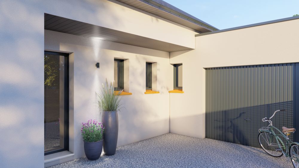 L’architecture de cette construction de maison individuelle ploemeuroise est contemporaine. Le mix toiture plate et pentue, les grandes baies, les huisseries gris anthracite soulignent la signature contemporaine. Le jeu des volumes et leur décalage crée une dynamique intéressante cassant la monotonie de l’habitat mono-bloc.