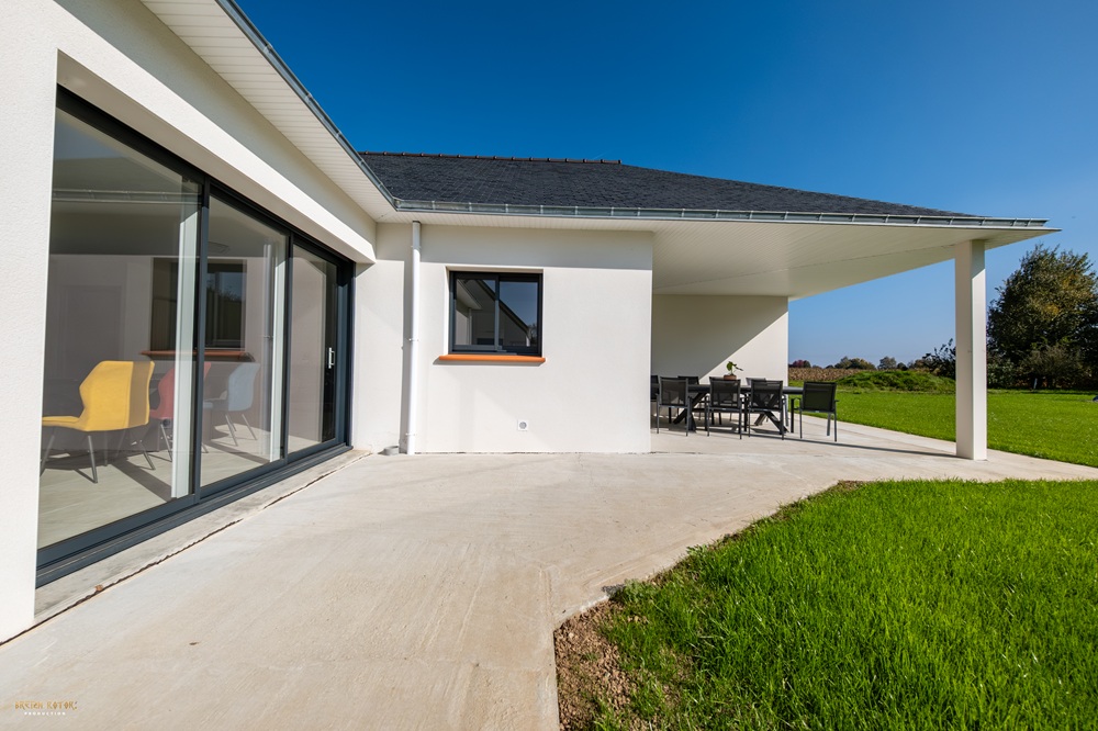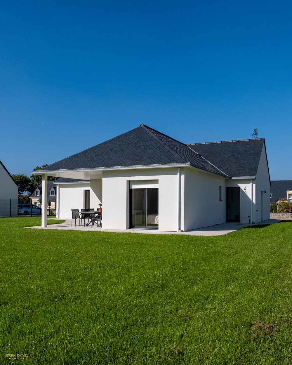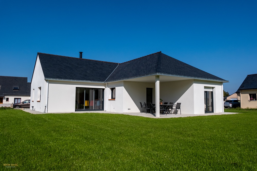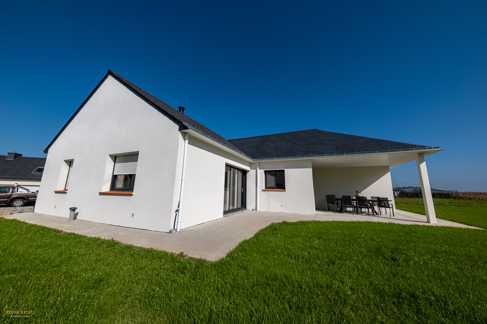 Cette construction de plain-pied à Pluméliau, d’une superficie totale de 112 m², se caractérise par une conception fonctionnelle et un agencement optimisé, fruit de notre expérience. Cette maison individuelle se démarque par son plan en L astucieux, articulant harmonieusement l’espace de vie convivial et l’espace nuit plus intimiste, garantissant ainsi une séparation claire entre les zones de jour et de nuit.