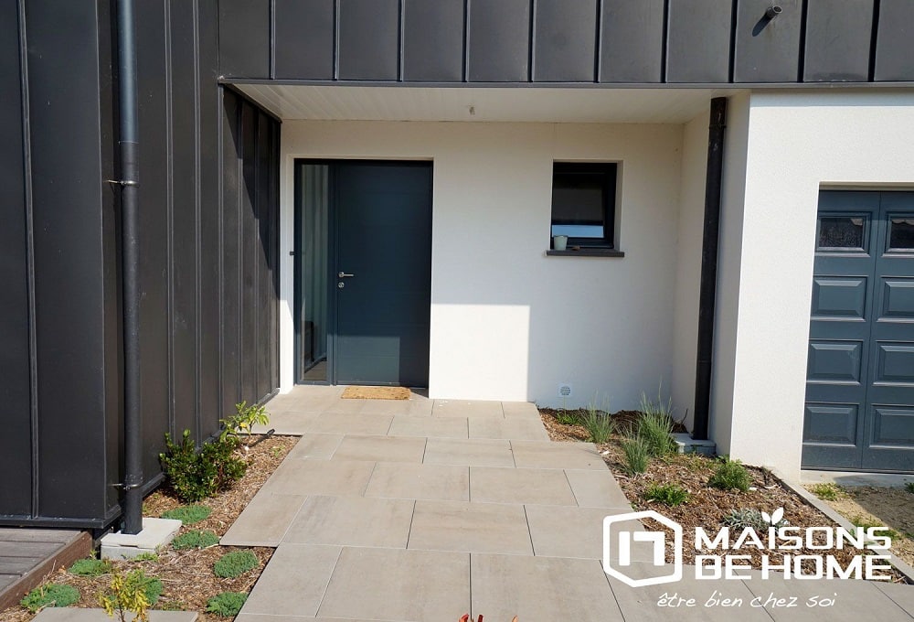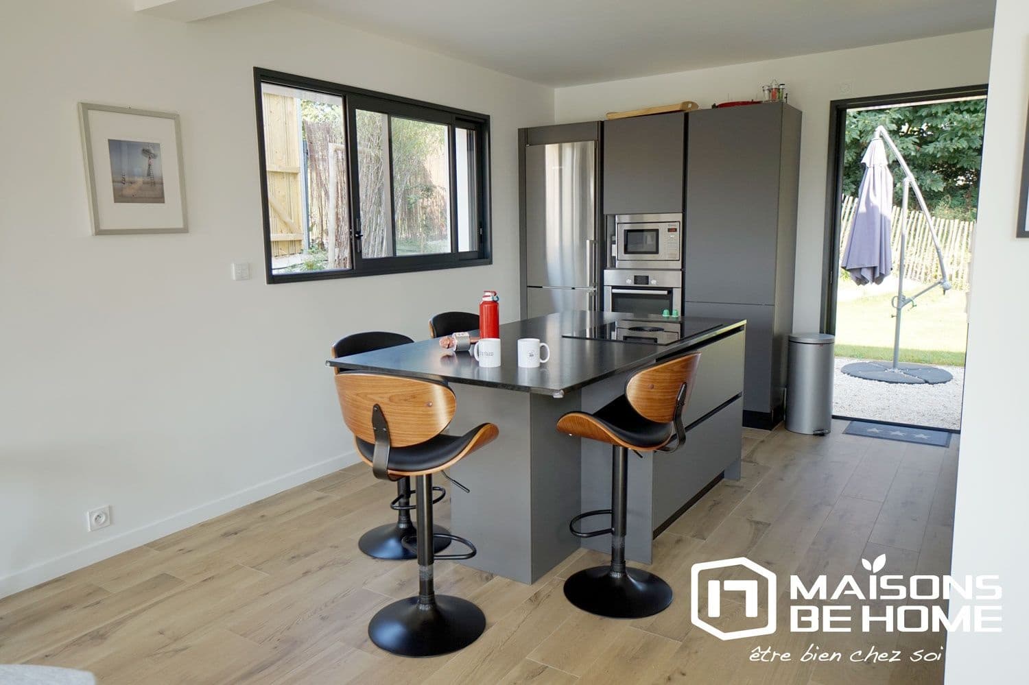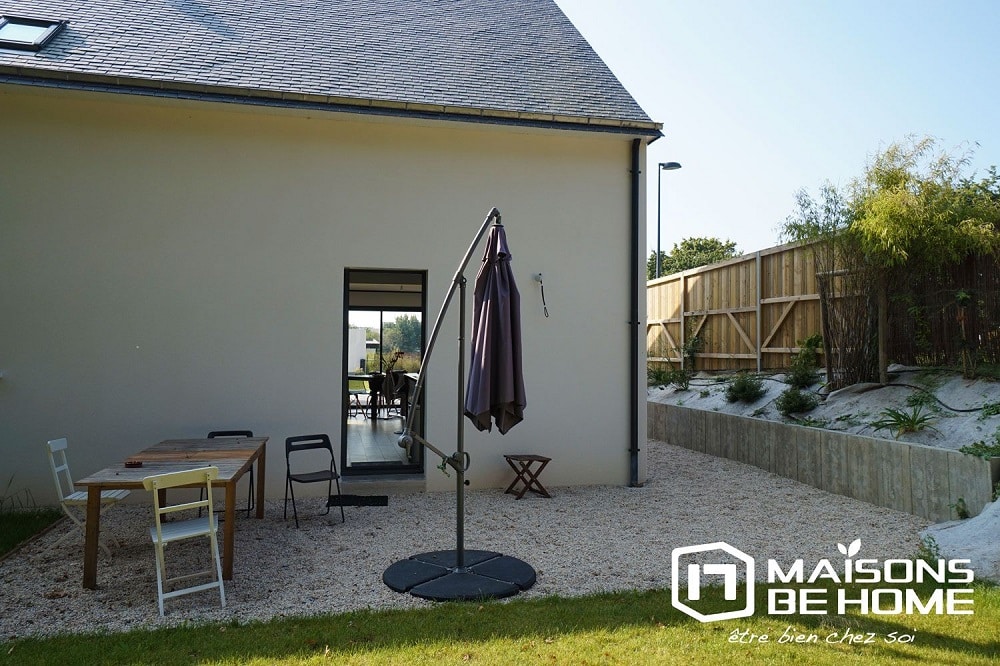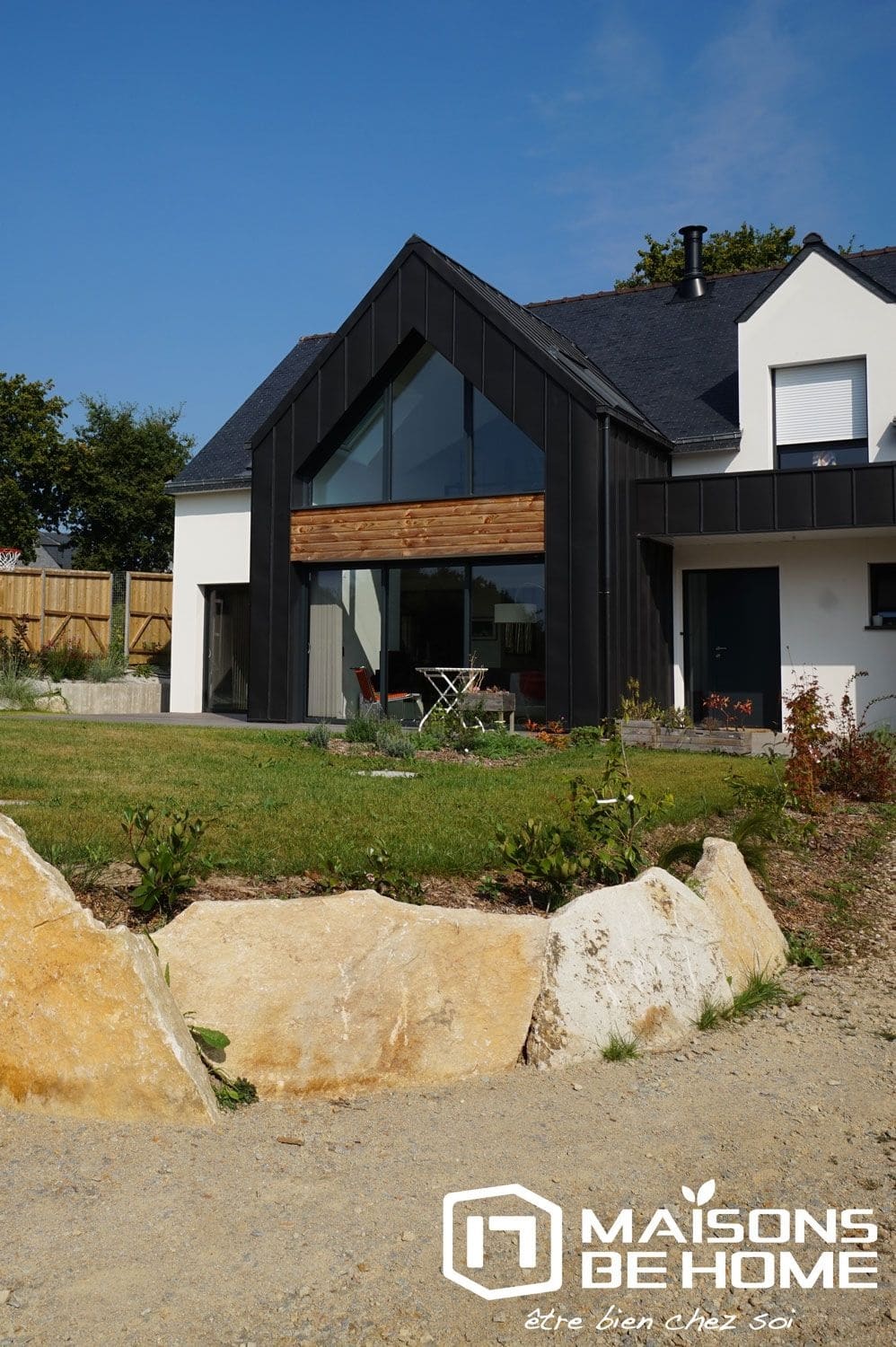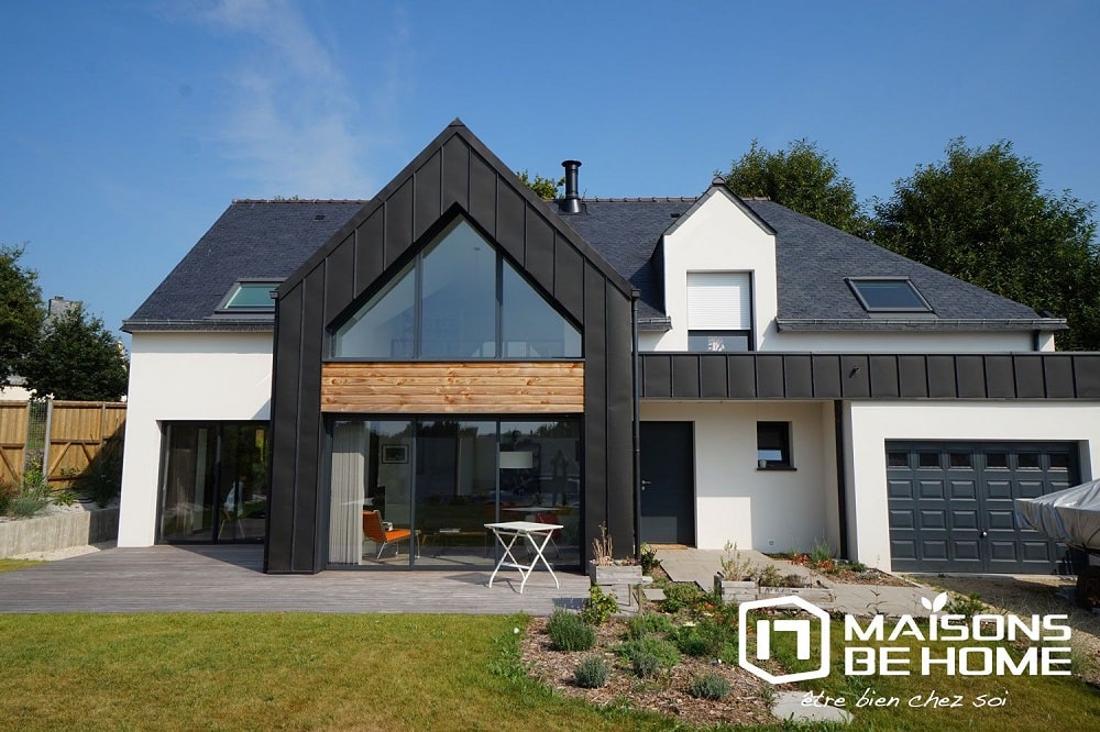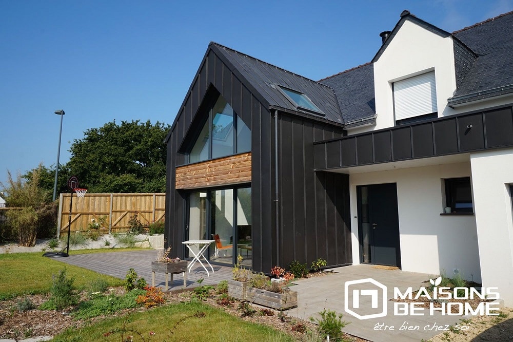 Maison Be Home, constructeur de maisons à Ploemeur dans le Morbihan (56) joue avec les matériaux et les volumes. L’adoption du zinc, du bois et de l’enduit pour le revêtement de façade apporte une touche de modernité à la construction. Le mix matériaux est aussi adopté pour la couverture ; l’association d’une couverture zinc avec une couverture ardoises est en effet proposée pour cette habitation. Le toit 2 pentes bizeauté sur le côté est combiné à un toit plat. La belle avancée résolument moderne vient dynamiser la façade sud. Le constructeur propose une architecture originale et surtout sur-mesure pour ses clients.