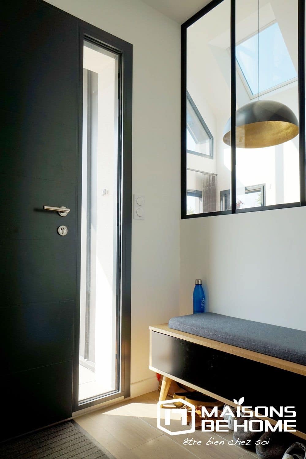 L’entrée s’effectue dans un hall d’entrée éclairée par une verrière donnant sur le séjour et une porte en partie vitrée. L’entrée est complétée par des toilettes. Elle permet d’accéder au reste de la maison et au garage.