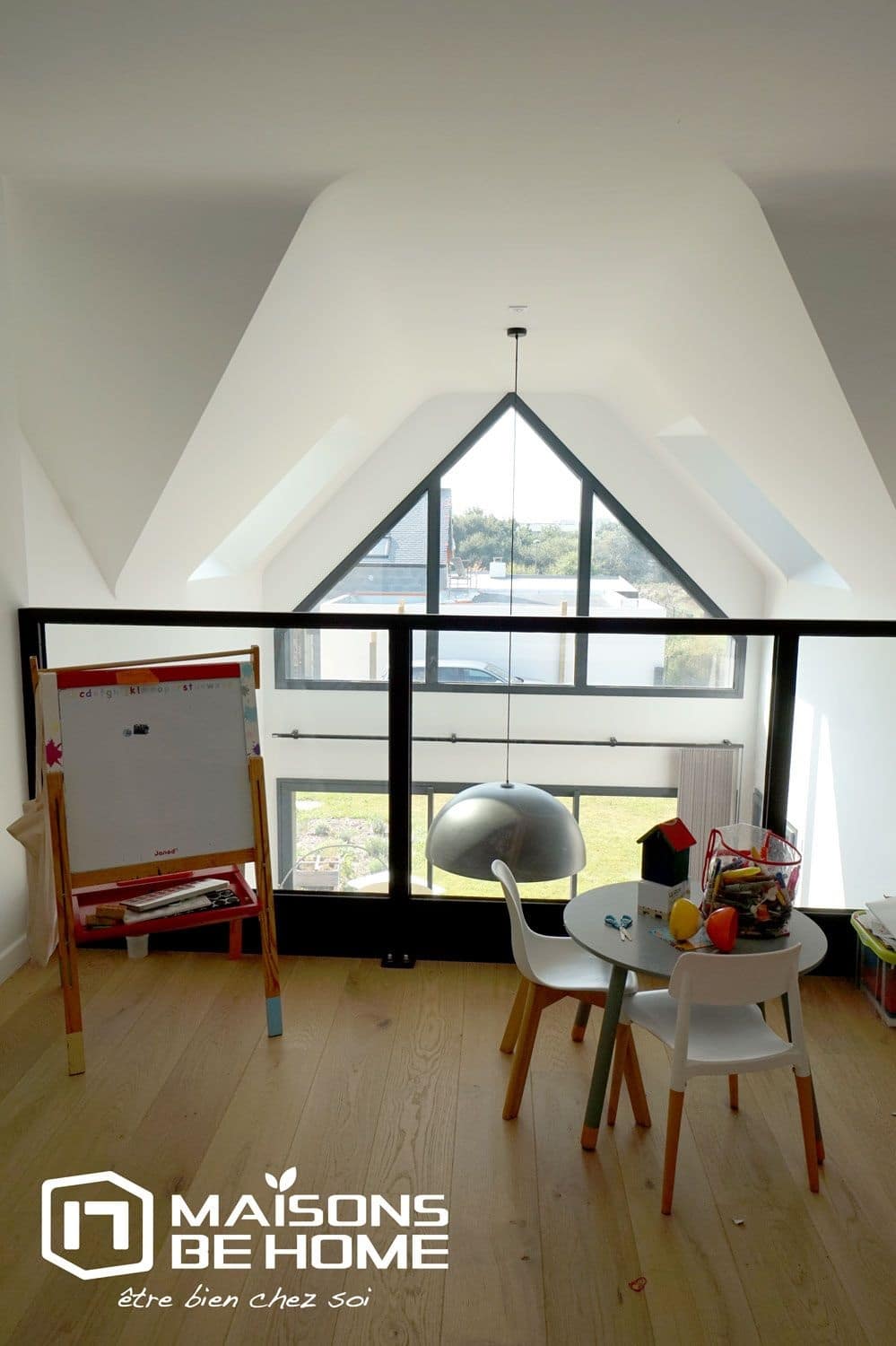 L’étage accueille une belle mezzanine donnant sur le séjour et 4 belles chambres. La mezzanine permet de créer une zone de séparation entre les chambres créant ainsi plus d’intimité. Cette mezzanine permet d’aménager un coin bureau ou jeux au fil des besoins des propriétaires.