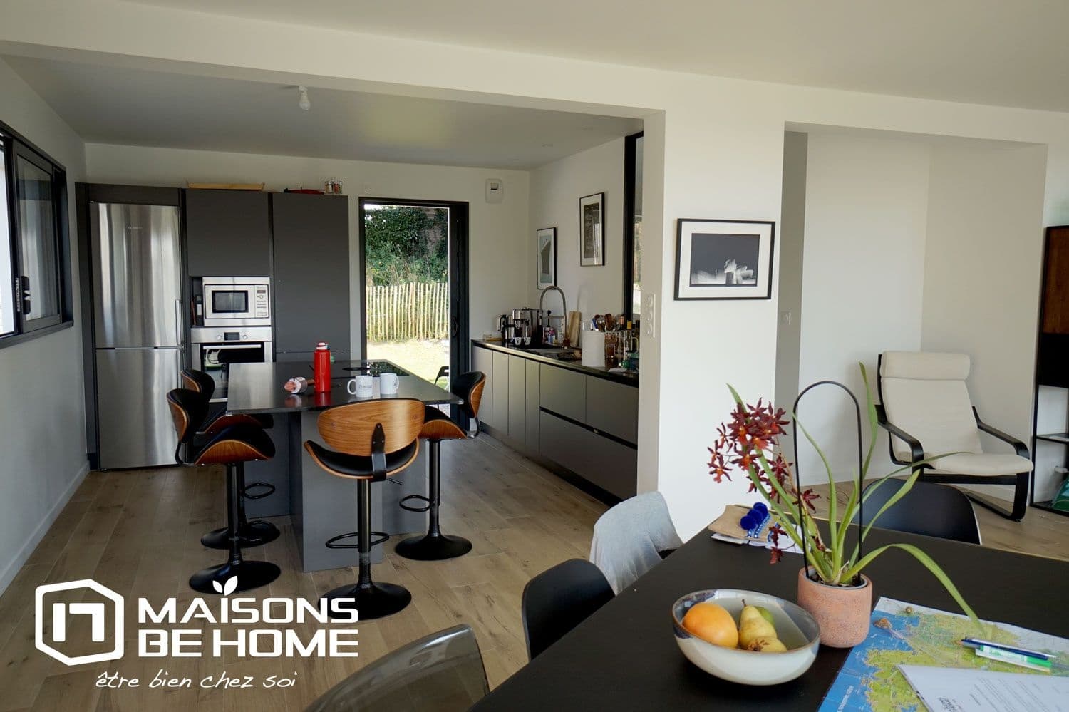 Découvrez cette construction de maison à Ploemeur, dans le Morbihan (56). Cette maison individuelle sur-mesure propose 5 chambres et une surface de près de 170 m². L’architecture de cette construction se distingue par sa belle avancée habillée de zinc et de bois ; celle-ci est déplafonnée de manière à faire profiter au salon d’un grand volume. Découvrez les vues extérieures et l’agencement intérieur en photos, proposé par le constructeur.