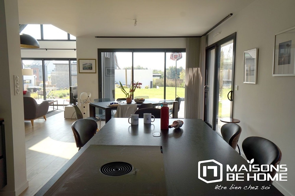 Au rez-de-chaussée de cette construction à Ploemeur, se trouve une belle pièce de vie très lumineuse. Cette pièce de vie est traversante. Eclairée par le toit par 2 vélux, au sud par un mur façon rideau et une baie vitrée 3 vantaux et à l’ouest par une baie vitrée 2 vantaux, ce salon-séjour est très lumineux toute l’année. Le plafond cathédrale et l’avancée dynamisent les volumes intérieurs créant ainsi des espaces bien différenciés au sein de cette pièce de vie. Le salon-séjour s’ouvre sur une belle terrasse d’angle en bois.