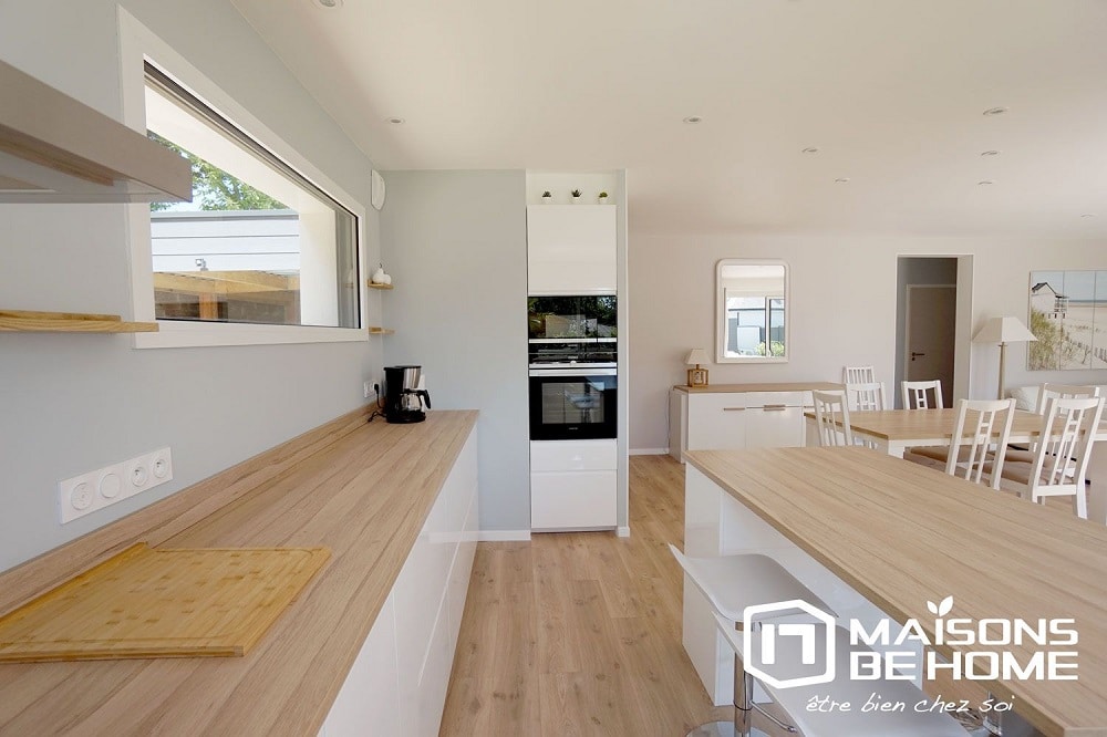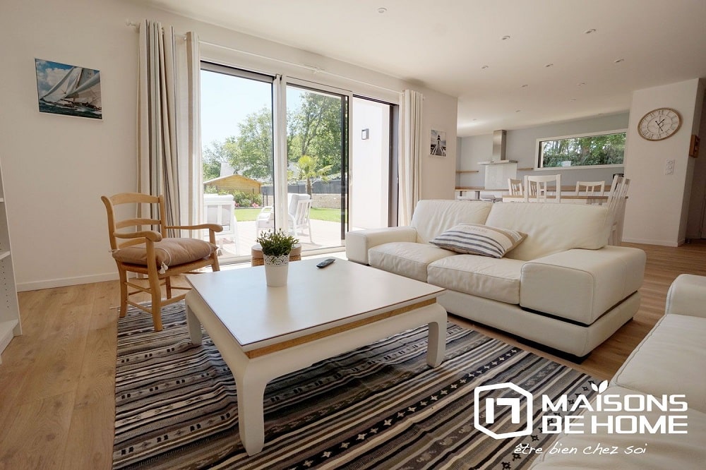 L’espace jour de cette maison de plain-pied comprend un beau séjour donnant sur la terrasse avec son coin séjour et son espace salon. L’accès à la terrasse s’effectue par une grande baie vitrée 3 vantaux. Une cuisine ouverte sur le séjour complète la pièce de vie ; cette cuisine est trés lumineuse grâce à 3 ouvertures (Ouverture au sud sur le jardin, sa porte fenêtre sur la terrasse et une ouverture horizontale) à l’ouest.